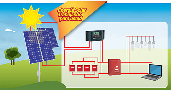 Los paneles solares generan energía eléctrica a partir de la radiación solar, y esta energía se almacena en baterías con apoyo de un controlador de carga. Las baterías necesariamente tienen que ser de descarga profunda si se quiere garantizar una durabilidad del proyecto. Una vez que la energía se encuentra en las baterías, ésta se puede extraer de manera inmediata o bien guardar para un consumo posterior (típicamente en la noche). La energía se extrae de las baterías con un dispositivo llamado inversor, que es el produce un voltaje de 127V de corriente alterna. Esto es particularmente útil porque la mayoría de los aparatos eléctricos de nuestra vida cotidiana (focos, televisores, radios, refrigeradores, computadoras, etc.) operan con este voltaje.